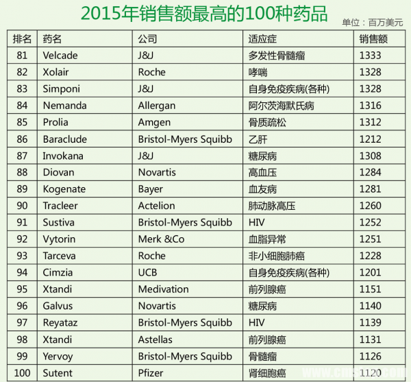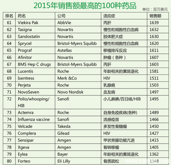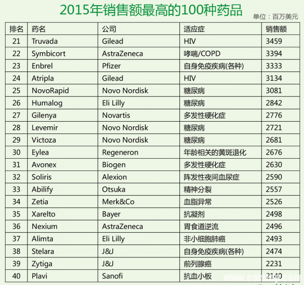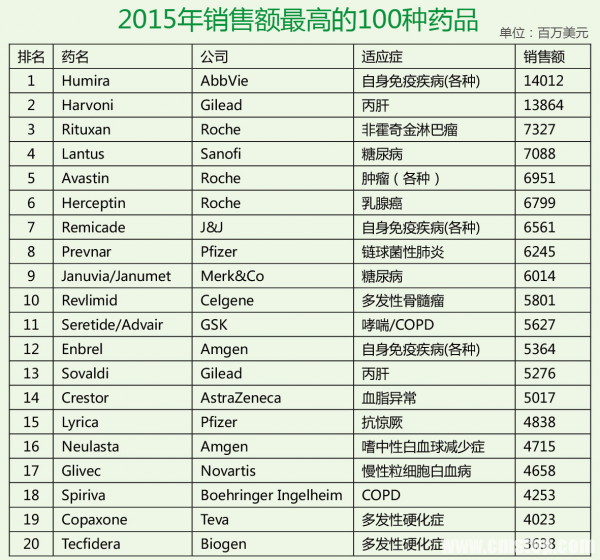 FirstWord发布2015年销售额最高的100种药品清单,加起来超过2650亿美元。前十个就达800亿美元。而前两个产品单药Harvoni和Humira销售超过100亿美元。