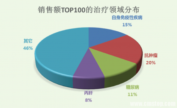 Johnson&Johnson前100的药品中就占了九个,Bristol-Myers Squibb,Novartis和Roche前100的药品中就占了八个,Amgen有七个,Gilead有六个。