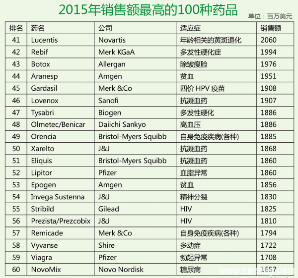 在过去的几年内推出其他 100 强药物包括 Tecfidera(Biogen,多发性硬化症),Xarelto(Bayer/J&J,抗凝剂),Eliquis(Bristol-Myers Squibb,抗凝剂),Stribild(Gilead,HIV)、Eylea(Regeneron/Bayer,AMD)、Invokana(J & J,糖尿病)和Xtandi (Astellas/Medivation,前列腺癌)也在表单。
