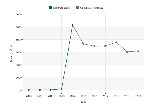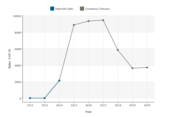 接下来的几年里,由于受Harvoni上市影响,预计Sovaldi的年销售额将有较大幅度的下降,稳定在70-80亿美元左右(见图1)