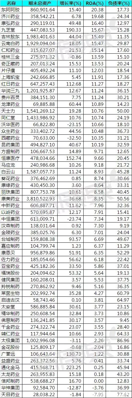 总资产增速TOP10企业中,增速最低的康弘药业达到49.48%,最高的通化金马则达到223.25%。被借壳的九芝堂和积极收购医院的恒康医疗总资产增速分列二三位。然而,值得注意的是,总资产增速TOP10企业的ROA(总资产回报率)却总体表现平平,其中,仅有九芝堂的ROA进入前十。