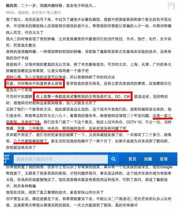 对于魏则西,一位专家阐述这样的观点,供大家参考:这是一个不好的例子,表面上是谴责百度、武警二院和莆田系(当然需要谴责),实际上又要引起医患矛盾及对免疫治疗的误解!肿瘤目前为止仍是不治之症,不管是免疫疗法还是其它疗法。固然花了这么多钱没有治好让人感到惋惜,但换了别的治疗,也同样挽救不了生命。免疫疗法从来就不是治疗癌症的一线疗法,但对缓解病情,减轻其它治疗带来的副作用,改善病人生存质量还是有明显作用的(切不说目前开展的一些新技术)。就文中提到的DC-CIK本身,关键问题还在于免疫细胞的质量与数量,适应症的选择。就这个病例而言,也许免疫治疗不是最好的选择,或者我更怀疑是免疫细胞的质量问题。但任何治疗,尤其是癌症的治疗都不是百分之百有效,不能等治疗失败后反过来抱怨或指责!百度的竞价排名是个恶瘤,利益驱动结果。但纵观目前各行各业哪个不是利益驱动?一味谴责百度,不如自己自律!那个公司是否真正采用美国技术文章中很明确,其实是照抄美国技术,但抄的怎样就不知了。美国也不是不用DC-CIK,而是有了更好的代替,如CAR-T,NK等。但并不是DC-CIK不好,如果有“好”抗原负载,也应该不错。将来也许会有更好的进展。媒体上所谓”谋财不害命”或“谋财害命”都是哗众取宠,不是认真的态度。这件事百度要改,医院要吸取教训,但不能由此而阻碍免疫治疗技术的发展。另外,由此引申的思考,多少肿瘤患者由各种治疗而死亡?多少患者由不正规的私人医生治疗或验方、秘方治疗而死亡?我就不赞成目前流行的广告,没有买卖就没有伤害,不从源头上制止犯罪,而怪罪于交易的人们,于这个事件又何其相似也?"
