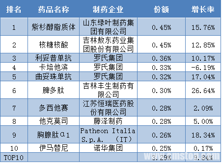 表3:2015年抗肿瘤和免疫调节剂药品销售前十品种