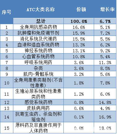 按照药品分类统计,依然是全身用抗感染药物、抗肿瘤和免疫调节剂、消化系统及代谢药、位列前三甲,此三类药品占据了将近一半的市场份额,可见此三类药品市场需求的巨大。