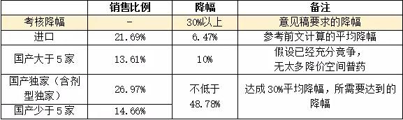 接下来,我们做一个简单的数学题,假若进口药品平均降幅仅6.49%,一些常见普药降幅不足10%,经过测算,国产独家药品,国产较少厂家产品需要承担不低于48.78%的降幅,才能达成试点城市对GPO组织的考核要求。