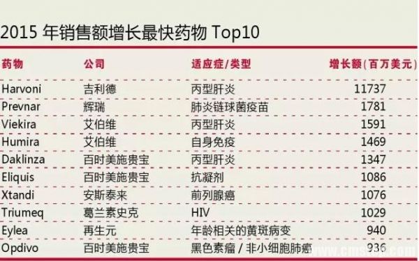 2015年全球销售额增长最快的前50种药物合计比去年增长410亿美元。仅吉利德(Gilead)的丙肝药物Harvoni带来的增长额就高达117亿美元,占总增长额的29%。