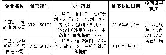 昨日(6月2日),广西食药监局发布公告,收回广西忠宁制药有限公司的GMP证书。而就在几日前,5月26日,广西省食药监局亦发布公告,收回广西金秀圣堂药业有限责任公司的GMP证书。