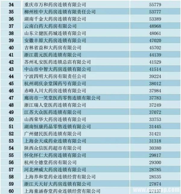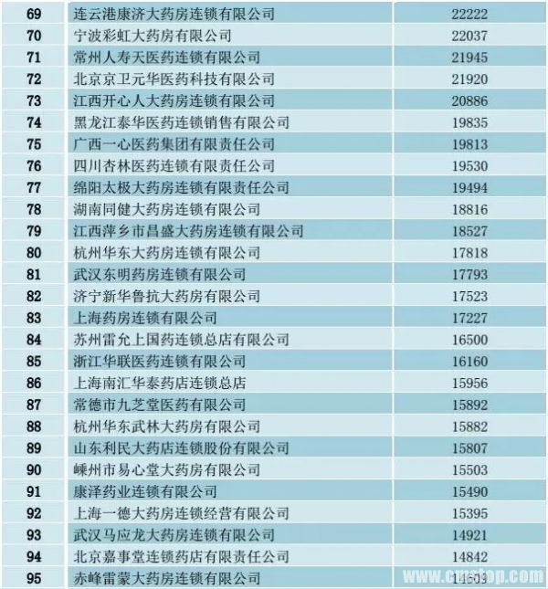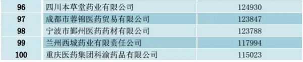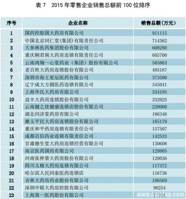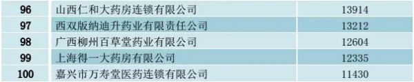 同样的,2015年零售企业销售总额前100位排序中,北京金象大药房医药连锁有限责任公司和国药控股国大复美大药房上海连锁有限公司因合并入国药控股国大药房股份有限公司,不再独立参加排序。