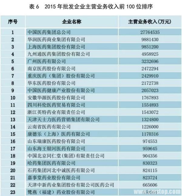 2015年批发企业主营业务收入前100位排序中,上药集团常州药业股份有限公司和上药凯仑(杭州)医药股份有限公司因合并入上海医药集团股份有限公司,不再独立参加排序。