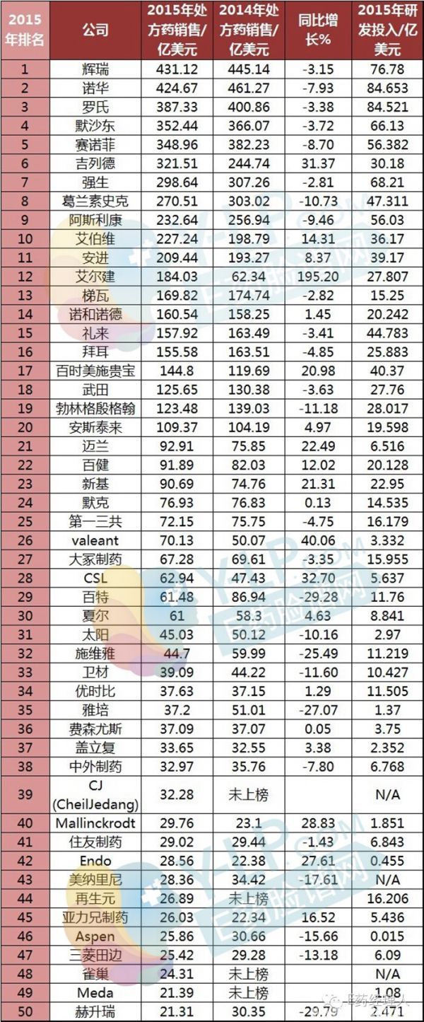 2015年的全球制药50强共有四家新入者,他们分别是排名39位的希杰(CJ)韩国株式会社、44位的再生元、48位的雀巢和49位的Meda。