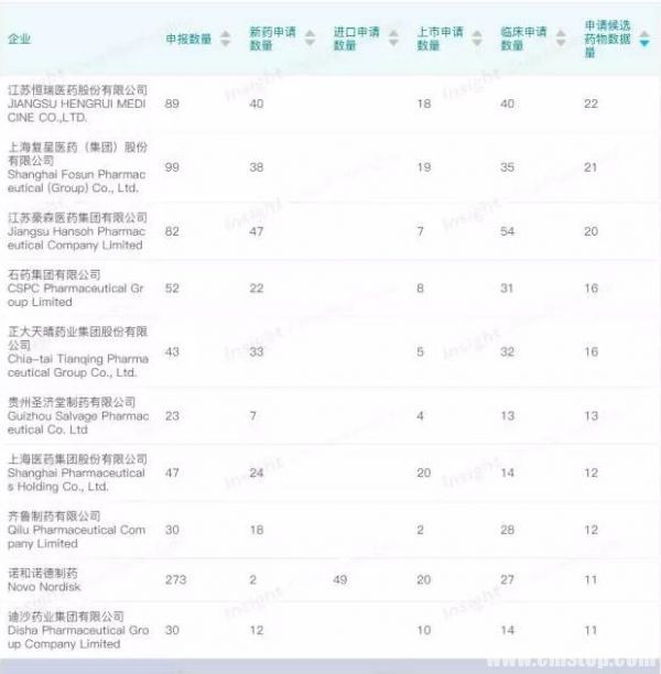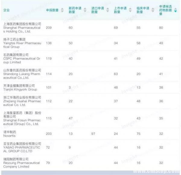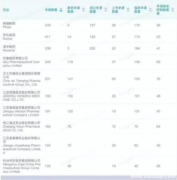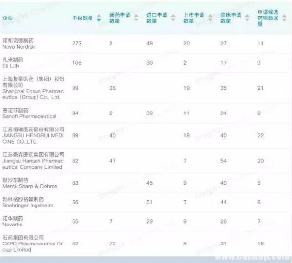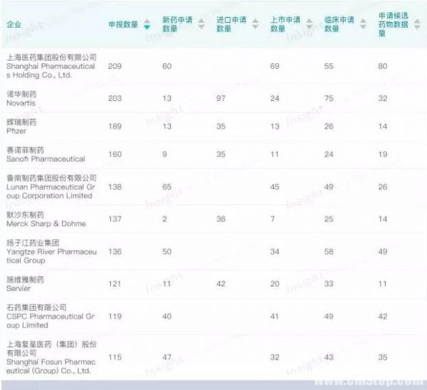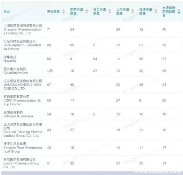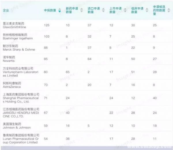 即使从申报药物品种数量角度来看,诺华、GSK 和强生也不甘落后,依然挺进前十。