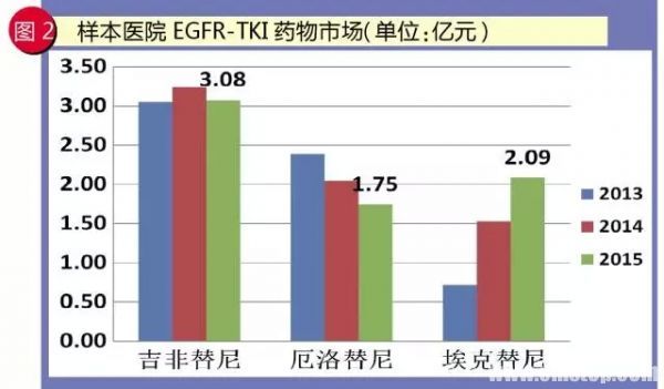 作为第一个在中国获批的EGFR-TKI,易瑞沙通过在中国的多年推广,已经获得了巨大的市场规模。根据PDB样本医院数据库,2015年易瑞沙样本医院销售额为3.08亿元,位居该类药物销售额首位。但随着埃克替尼上市,易瑞沙受到了一定的影响,2015年销量有所萎缩。