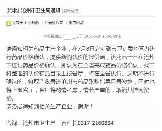 昨日(6月28日),一份河北沧州市卫生局确认调价的文件,在医药行业论坛和微信群引起了骚动。笔者查询沧州卫生局并未公开此文件,但有知情人士表示,有人给沧州卫生局打过电话,说真有此事。通知内容如下: