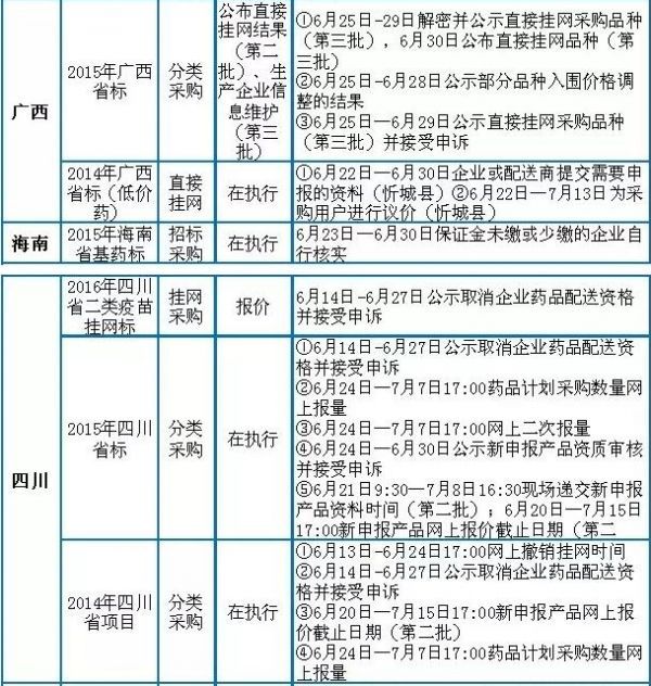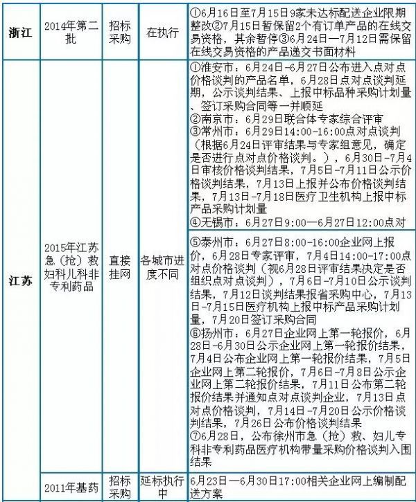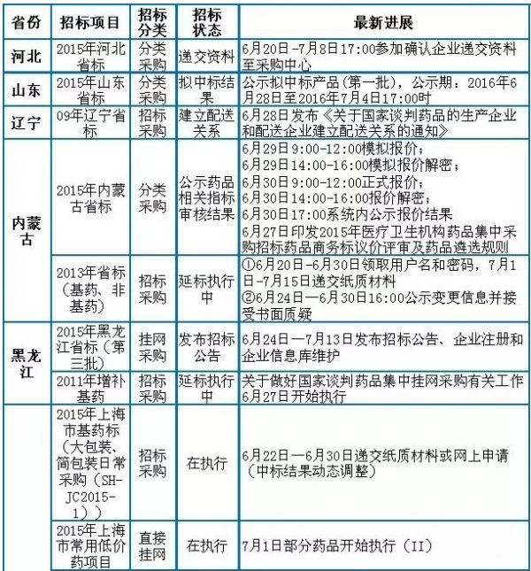在有关药政群里,有药企反馈称,他们跟当地卫生局核实过信息,该信息属实,另经企业核实,沧州市要求企业确认的北京、天津的价格。 6月8日,河北省招标采购平台发布通知称,要采用天津市的中标价格,现在沧州市又要求企业确认天津和北京中标价格。 这是否意味着未来河北不再进行单独的价格招标?现在政府一致在推动京津冀一体化,医药市场一体化要走在前列了? 国家卫计委拟督察,下半年招标速度会加快 根据2015年国家卫计委70号文,要求各地招标采购药品的开标时间统一集中在每年11月中下旬。实现招标采购政策联动,方便生产企业理性投标、提前组织安排生产,避免药品价格因开标不同步产生波动。 当时,就有众多业内人士感到困惑,开标时间是开始招标时间还是结果公布时间,2015年国办发7号文要求各省要启动新标,那各省究竟能否做到2015年11月底开标?事实告诉我们,不能做到,虽然是有少部分省份赶在2015年11月底前开标了,而却有不少省份是之后才开标,甚至有部分省份现在还在招标进行中。 而据消息人士透露,卫计委目前正在委托第三方机构做详细的考核表,然后分省督察,以此表做考察各省加快药品招标进展的依据。预计,接下来各省会加快招标的进度。 截至目前为止,全国目前各省发布药品集中采购方案的情况是: