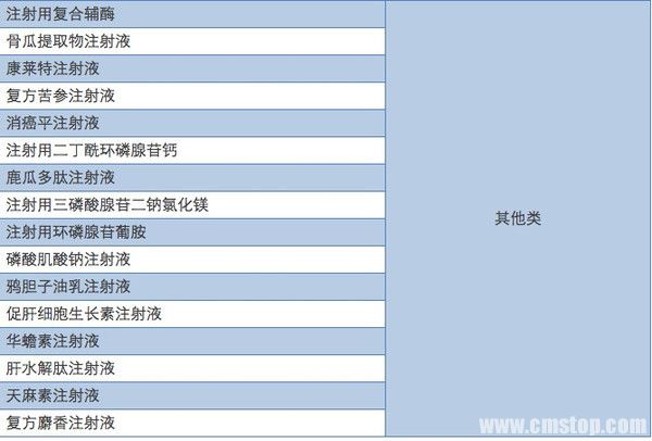 说明:本目录中的注射剂包括:注射剂、注射液、注射用溶液剂、静脉滴注用注射液、注射用混悬液、注射用无菌粉末、静脉注射针剂、水针、注射用乳剂、粉针剂、针剂、无菌粉针、冻干粉针。