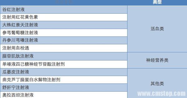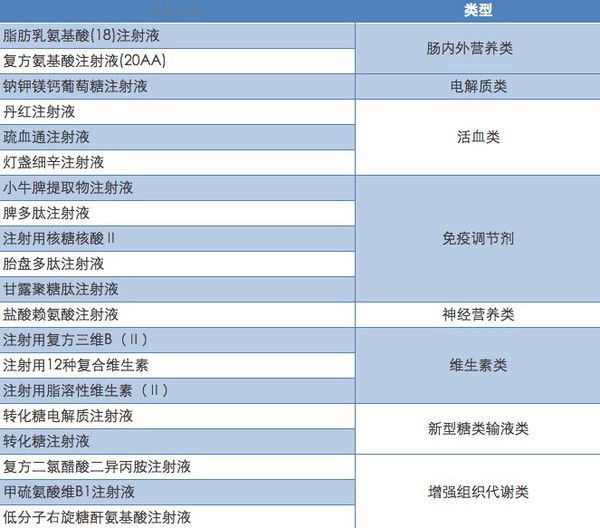 主要分为增强组织代谢类、活血类、神经营养类、维生素类、电解质类、自由基清除剂、免疫调节剂、新型糖类输液类、肠内外营养类、其他类等十类。