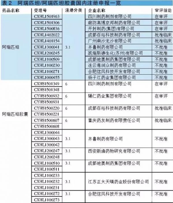 阿瑞匹坦尚未实现国产化。CFDA已于2013年7月22日批准原研公司的阿瑞匹坦胶囊(商品名:意美)进口中国,国内该品种市场正处于培育期。迄今,我国已有包括四川制药制剂和辅仁药业等在内的多家企业向CFDA提出有关阿瑞匹坦胶囊的注册申请。然而,至今仅成都百裕和重庆药友获得临床批文,包括扬子江药业、江苏正大天晴和成都地奥等在内的6家企业的审评结论均为“不批准”(详见表2)。可见,尽管本品国内企业关注度颇高,但顺利获得临床批文的企业并不多。