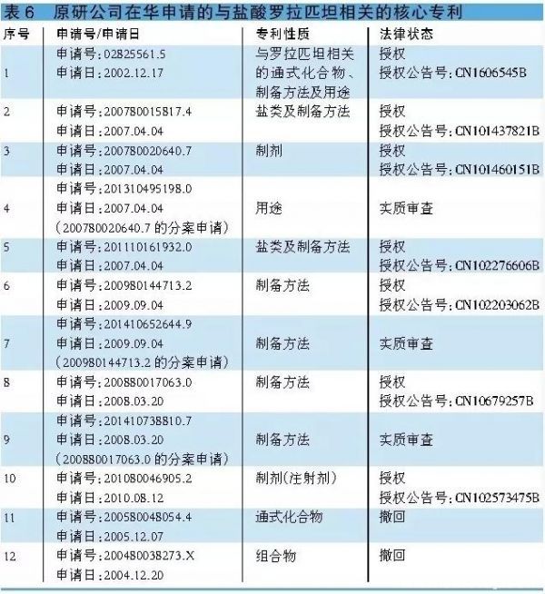 于2007年4月4日申请的200780020640.7是一项与盐酸罗拉匹坦一水合物相关的制剂专利,该专利已获得授权(授权公告号:CN101460151B),将于2027年4月4日到期。此外,为获得更多的专利保护,原研公司在华还申请了与盐酸罗拉匹坦相关的制备方法、注射剂等相关专利(详见表6)。