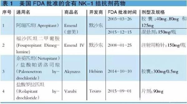 奈妥匹坦/盐酸帕诺洛司琼是FDA于2014年10月批准的用于治疗癌症化疗引起的恶心呕吐类药物,该药是由NK-1拮抗剂奈妥匹坦和5-HT3受体拮抗剂盐酸帕诺洛司琼组成的复方制剂,可预防化疗后24小时内至12小时产生的恶心呕吐。