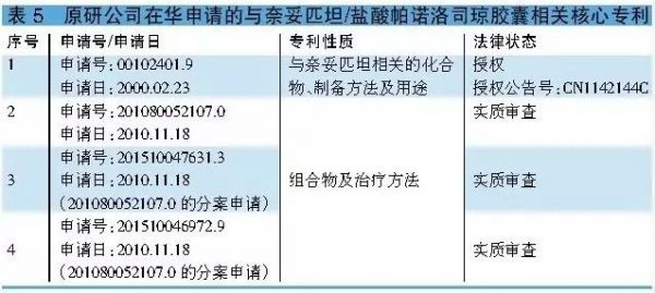 值得一提的是,与奈妥匹坦/盐酸帕诺洛司琼胶囊相关的制剂组合物专利是于2010年11月18日申请的201080052107.0,该申请涉及两项申请,分别是201510047631.3和201510046972.9。目前,上述三项申请均处于实质审查阶段。若上述三项申请获得授权,其保护期将至2030年11月18日(详见表5)。