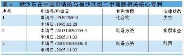 福沙匹坦二甲葡胺相关的化合物专利95192860.0已于2015年2月失效,而一项与福沙匹坦二甲葡胺制备方法相关的专利申请200580038036.8已被驳回,另一项专利申请201310096453.4目前处于实质审查阶段(详见表4)。