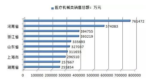 2015年全国医疗器械类销售额排名前10的省区是:广东、河南、北京、浙江、安徽、山东、四川、上海、黑龙江、湖南。排名前10省区销售额占全国销售总额的比例分布为:13.39%、10.10%、6.94%、6.92%、5.90%、5.75%、5.48%、5.21%、4.53%、4.50%。