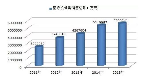 2015年全国医疗器械类销售总额为568.58亿元,较去年增加4.93%。2011-2015年全国医疗器械销售总额复合增长率(CAGR)为17.53%。