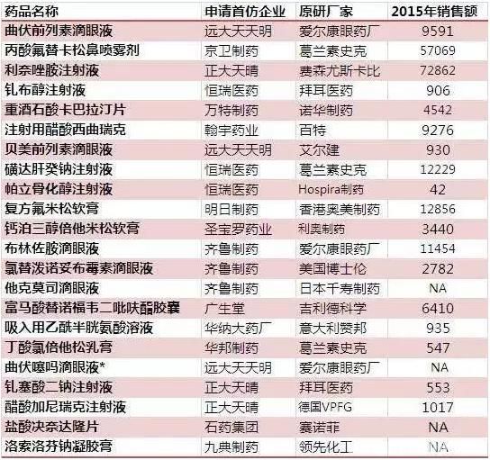 附:首仿药优先审评名单及2015年市场销售规模(万元)