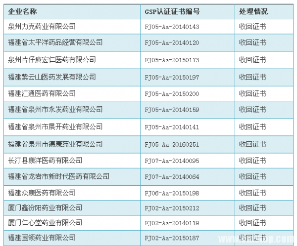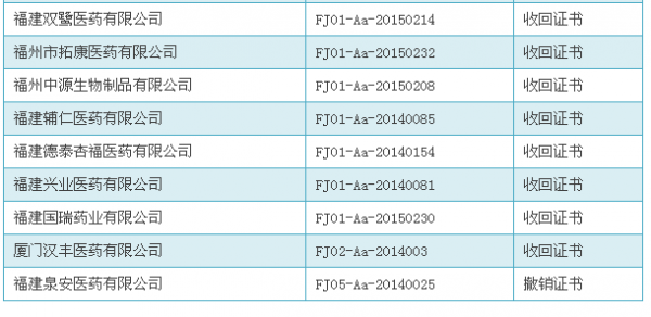 附:以下为赛柏蓝根据福建省食药监局官网通知公告整理的22家被收回GSP及1家被撤销GSP的药商名单