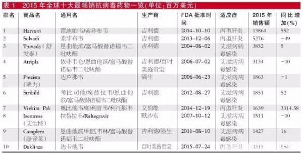 2015年抗病毒药物TOP 10品种中共有6个抗艾滋病药物和4个抗丙肝药物;有4个单方制剂、6个复方制剂;有6个归属于吉利德,另外4个分别归属于强生、默沙东、艾伯维和百时美施贵宝。(详见表1)