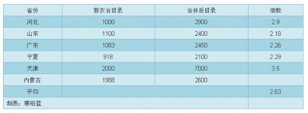 由此,我们可以看到,在合并前,农民只能享受到新农合基本用药目录内药品的医保报销,数量有限,但在合并之后,农民可报销的药品数量是原来的2倍以上,根据表中6省数据,其平均数甚至达到2.63倍。
