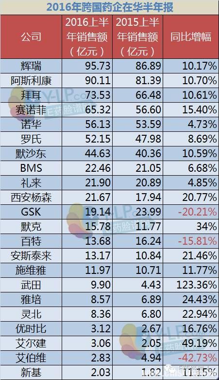 在经历了不太顺心的2015年后,2016上半年22家跨国药企在华总销额为647.68亿元,平均增长率为9.74%,有15家企业增幅在两位数,3家企业出现负增长。
