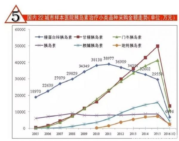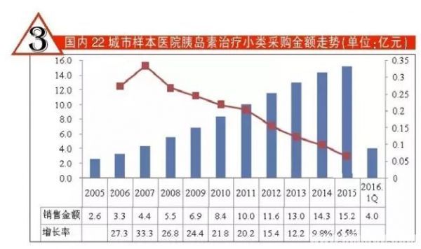 据中国医药工业信息中心PDB数据,2005年至2016年1季度,胰岛素治疗小类国内22城市样本医院采购金额走势见图表3。