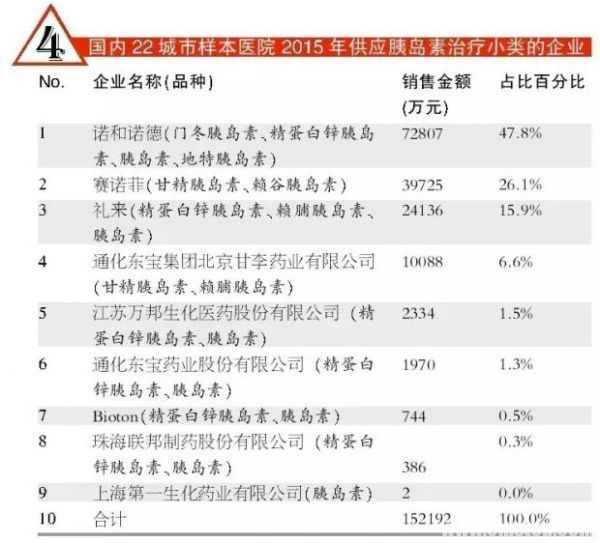 2005-2015年复合年增长率为19.5%,近二、三年增长率放缓,增长率低于10%。 据PDB数据,2015年有7个品种进入22城市样本医院采购,即:甘精胰岛素、门冬胰岛素、精蛋白锌胰岛素、赖脯胰岛素、胰岛素、地特胰岛素、赖谷胰岛素,分属9家企业。(见图表4)