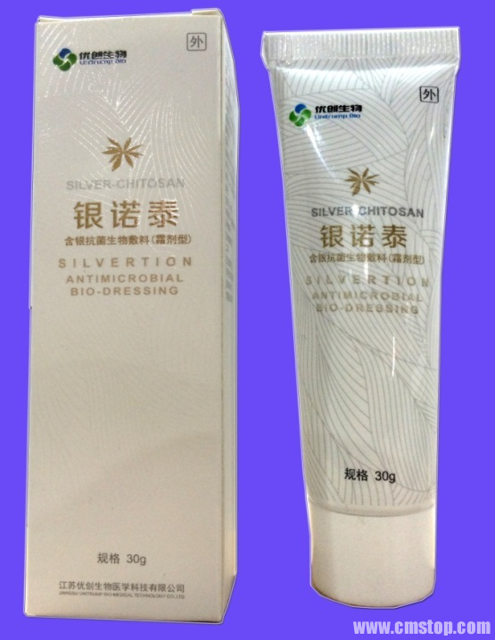 含银抗菌生物敷料(霜剂型),批准文号:苏食药监械(准)字2014第2640191号,医药招商企业江苏优创生物医学科技有限公司招商企业,适用于大面积创面包扎治疗用。含银抗菌生物敷料(霜剂型)招商详情请进入>>