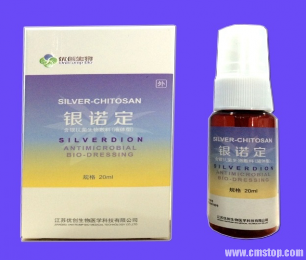 银诺定抗菌生物敷料(液体型),批准文号:苏食药监械(准)字2014第2640193号,医药招商企业江苏优创生物医学科技有限公司招商产品,产品适用于人体体表创面感染的控制、促进创面愈合。含银抗菌生物敷料(敷料型)招商详情请进入>>