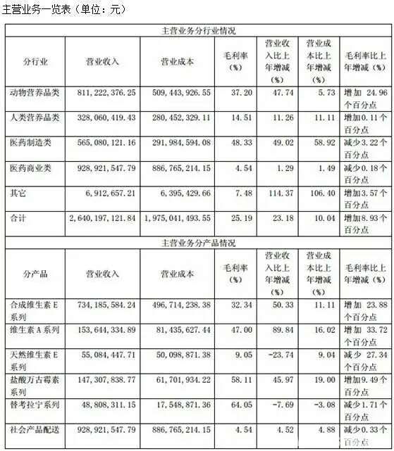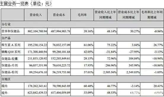 维生素A系列营业收入比上年同期增长75.22%,毛利率比上年同期增长26.77%,主要是价格上涨所致。辅酶Q10系列营业收入比上年同期减少31.84%,主要系价格及销量下跌所致。保健品-胶囊、保健品-片剂、保健品-粉剂比上年同期营业收入及营业成本有较大幅度增长,主要是新增合并子公司VB等所致。保健品-胶囊、保健品-片剂毛利率比上年同期下降10.94%、10.86%,主要是新增合并的子公司VB毛利率相比DRB较低。