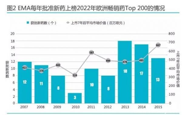 第2个趋势在图2中有所体现。图2展现的是2022年欧洲最畅销的200个药品中(基于2022年欧洲药品市场预测)于2007-2015年间获得欧洲药品管理局(EMA)批准的数量及获批药品的平均市场价值(基于上市7年后药品的实际或预测销售额)的情况。可见,经过改善的临床设计和医疗创新二者的综合力量促使药企推出的高市场价值的药品数量不断升高。