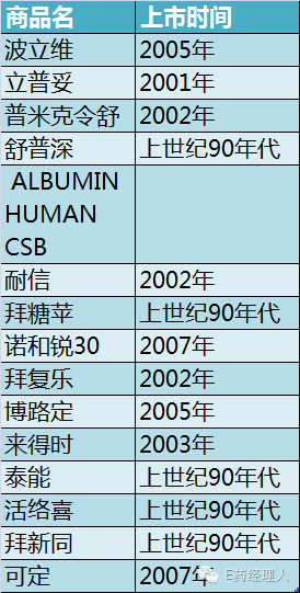 除此之外,跨国药企在华销售排名前15的药品中,大部分都是有10年历史,有的甚至超过20年。比如拜耳的拜唐苹和辉瑞的舒普深等,都是在上世纪90年代在华上市的产品。