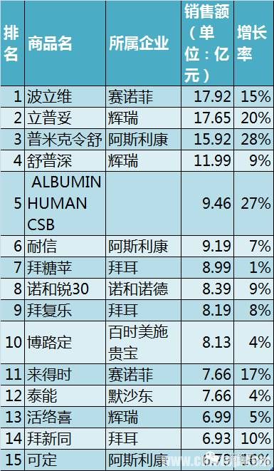 跨国药企在华2016年第二季度销售额排名TOP15的产品