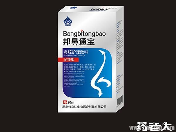 邦鼻通宝(鼻腔护理敷料) 20ml 喷剂,批准文号:鄂襄械备20140005号,医药招商企业湖北特必达生物医疗科技有限公司招商产品。适用于辅助治疗急慢性鼻炎、过敏性鼻炎、鼻窦炎及普通感冒症状(鼻塞、鼻痛、鼻干痒、鼻充血、流鼻涕、打喷嚏),也可用于鼻窦术后或放疗后的鼻腔冲洗护理。邦鼻通宝(鼻腔护理敷料) 20ml 喷剂招商详情请进入>>