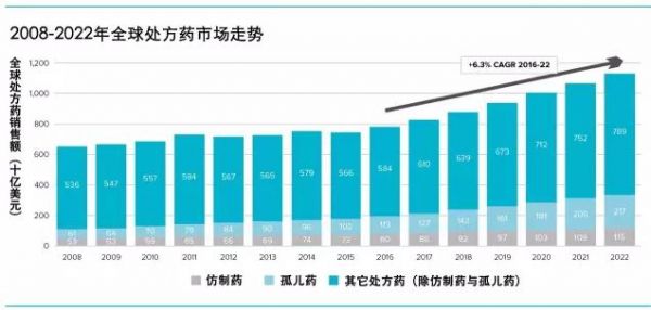 日前,EvaluatePharma发布了最新报告《2016全球制药展望》,对从当前到2022年全球制药行业的发展趋势进行了预测。报告分析,在此期间,全球处方药市场将以6.3%的年增长率扩容,到2022年达到突破10000亿美元的里程碑。