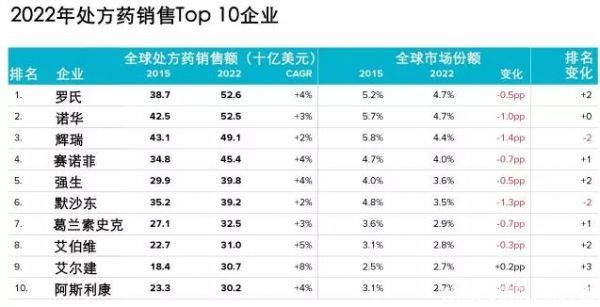 根据预测,2022年罗氏的处方药销售额将达到526亿美元(2015年为387亿美元),年增长率为4%;诺华仅以1亿美元的差距居后,2022年处方药销售额为525亿美元(2015年为425亿美元);紧随其后的依次是辉瑞(Pfizer)、赛诺菲(Sanofi)、强生(Johnson & Johnson)、默沙东(Merck)与葛兰素史克(GlaxoSmithKline)等。