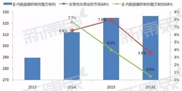 2013-2016E年β-内酰胺酶抑制剂复方制剂市场(亿元)及增长率(%)(数据来源:中康CMH)