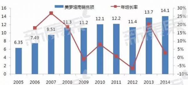 2005-2014年美罗培南全球销售额(亿美元)及年增长率(%)(数据来源:前瞻产业研究院)