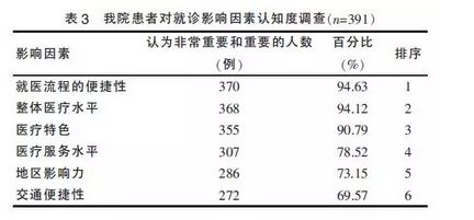 从问卷统计结果看,“就医流程便捷性”“整体医疗水平”“医疗特色”依次排名前3位,90%以上的患者认为对其就诊影响“重要和非常重要”。其中,“就医流程的便捷性”在专家咨询排序结果中位于6项因素的第6位,而在患者调查结果中位于6项因素排序的第1位。