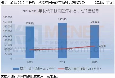 2015年中国长效干扰素医疗市场的销售额达到20亿元,主要有两家生产销售。目前长效干扰素产品主要包括罗氏的派罗欣(聚乙二醇干扰素α-2a)和先灵葆雅(默沙东)的佩乐能(聚乙二醇干扰素α-2b)。两者都被FDA获批治疗慢性丙型肝炎和慢性乙型肝炎。