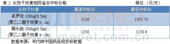 从米内网中国药品招投标数据可知,在各省份干扰素中标(在执行)价格中,派罗欣180ug/0.5ml最低单价为1055.53元/支,最高单价为1124元/支;佩乐能100ug/0.5ml 最低单价为1130.4元/支,最高单价为1256元/支。在派罗欣有效成分含量较高的情况下,比佩乐能最高便宜大约132元。