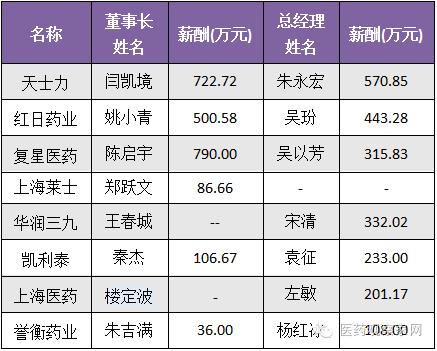 以下为医药观察家网整理的上榜的8家药企的董事长和总经理薪酬: