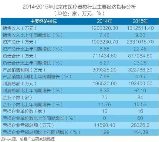 根据国家统计局统计,2015年北京市医疗器械行业规模以上企业数量有84家;实现销售收入131.25亿元,同比增长9.30%;实现产品销售利润32.28亿元,同比增长4.35%;利润总额为19.24亿元,同比下降2.10%。(具体数据指标详见下表。)